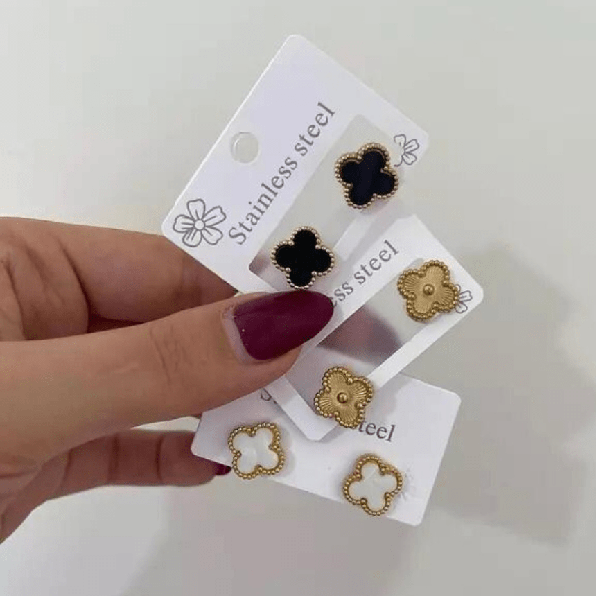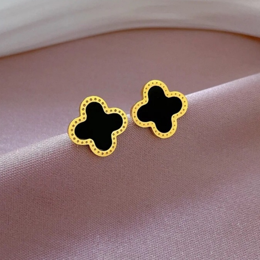 Elegant clover shape stud earrings made with high-quality stainless steel. Available in black, white and gold tones with a delicate beaded border finish. Lightweight, durable and perfect for daily wear as well as special occasions. Tarnish-resistant and skin-friendly – simple yet classy look for every outfit.