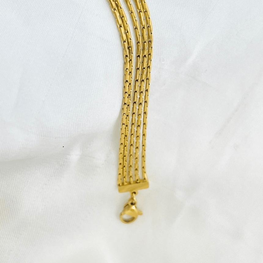 Elevate your wrist game with this striking multi-layer chain bracelet dipped in radiant 18K gold tone. Designed with sleek parallel chains that flow seamlessly into a polished bar detail, this piece embodies modern luxury with timeless appeal. The structured silhouette creates a bold yet refined statement, perfect for women who appreciate clean lines and confident styling.