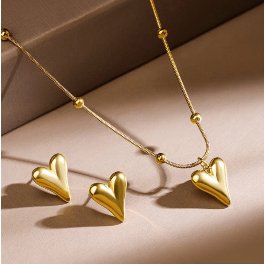 A stunning gold heart jewelry set featuring a necklace and matching earrings. The necklace has a delicate snake chain adorned with small gold bead accents, suspending a large, puffy 3D heart pendant with a smooth, high-polish finish. The matching stud earrings mirror the same bold, dimensional heart design. The entire set is crafted in a warm 18K-style gold tone.