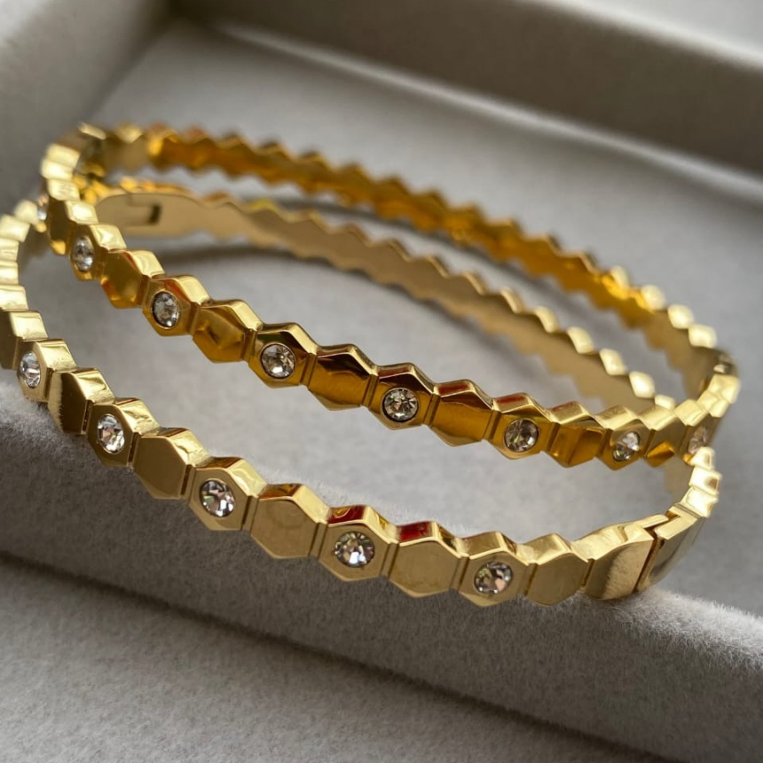 Designed for contemporary elegance, this luxury gold bangle set features sleek hexagon-shaped links accented with sparkling crystals. The structured yet graceful design adds a polished finish to any outfit, making it perfect for both daytime sophistication and evening glamour. Wear them solo or stacked for a bold look. Buy now and enjoy delivery across Pakistan.