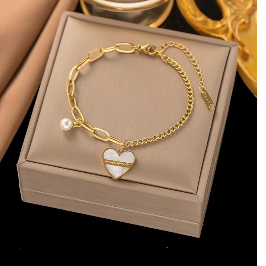 The centerpiece — a luminous white heart charm framed in polished gold — is accented with a subtle engraved detail, symbolizing affection and connection. A single pearl charm adds a soft, romantic touch, enhancing its luxurious finish.