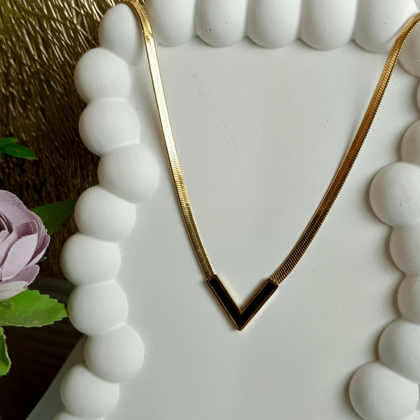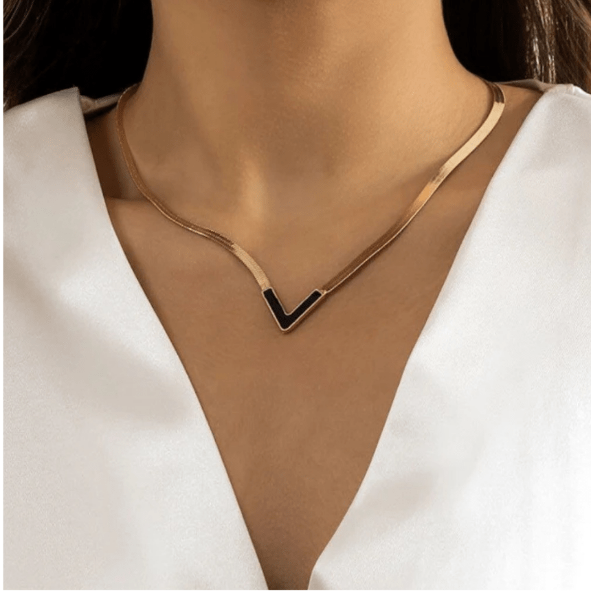 A sleek gold herringbone choker necklace with a dainty black V-shaped centerpiece — minimalist and elegant.